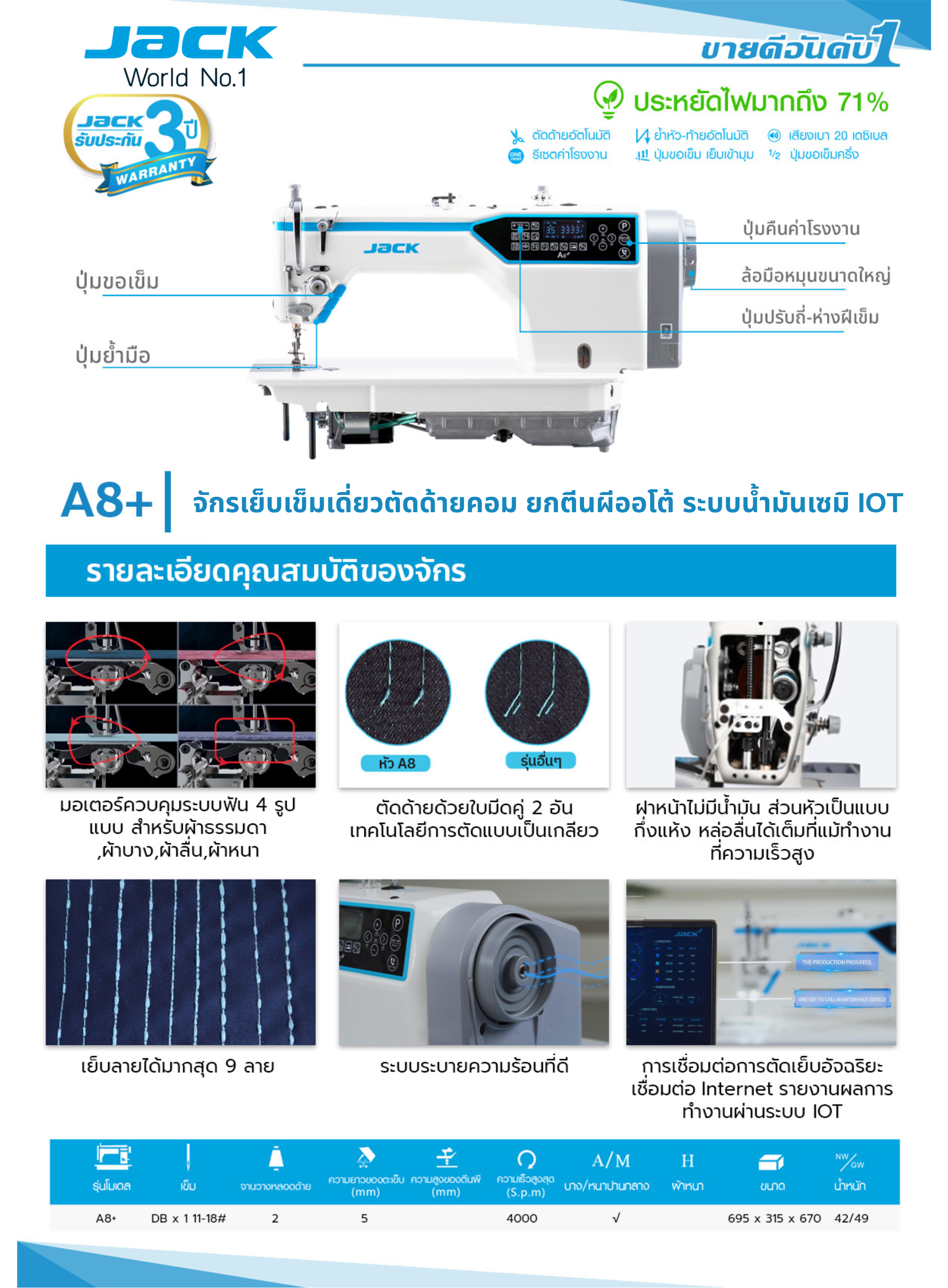 จักรเย็บเข็มเดี่ยวตัดด้ายคอม ยกตีนผีออโต้ ระบบน้ำมันเซมิ IOT JACK รุ่น A8+