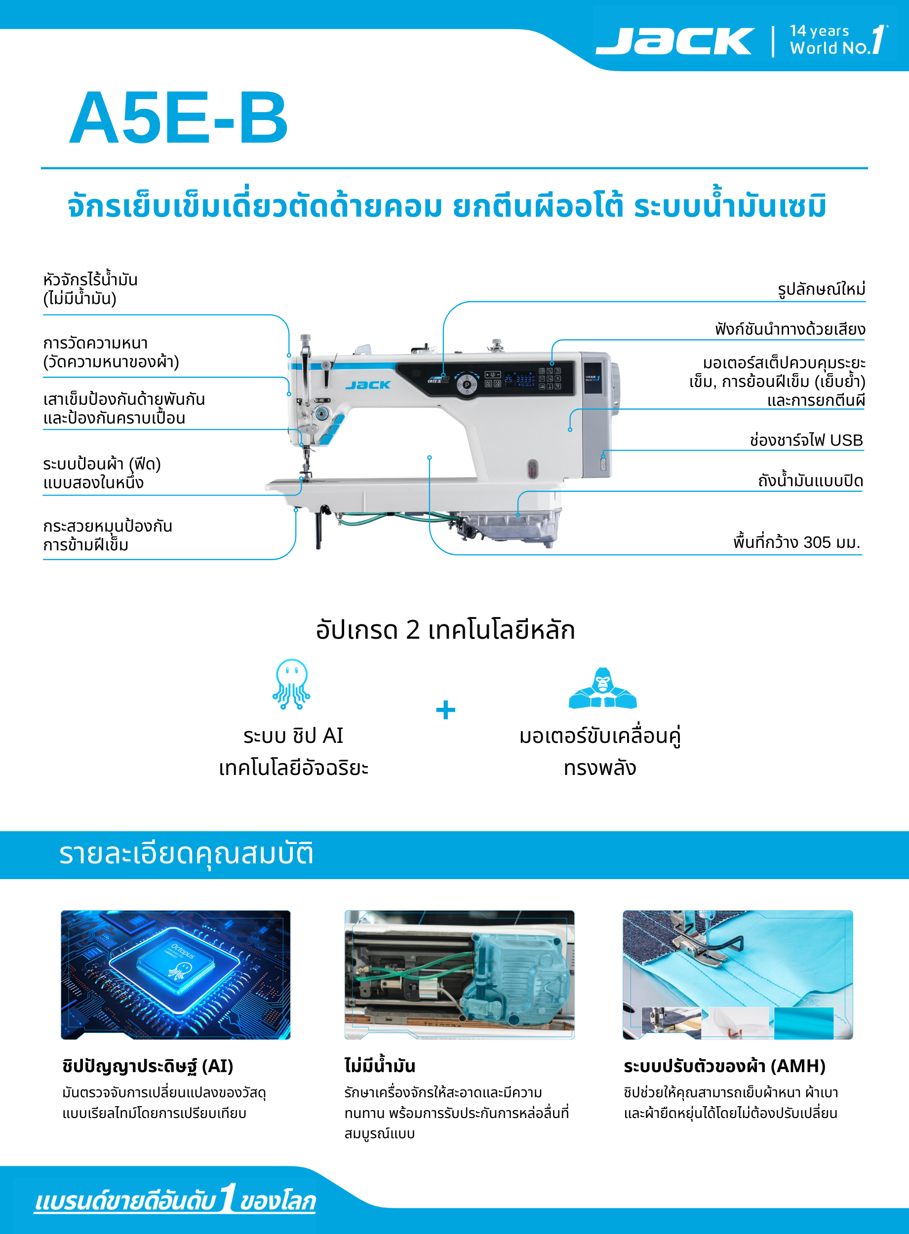 จักรเย็บเข็มเดี่ยวตัดด้ายคอม ยกตีนผีออโต้ ระบบน้ำมันเซมิ JACK รุ่น A5E-B